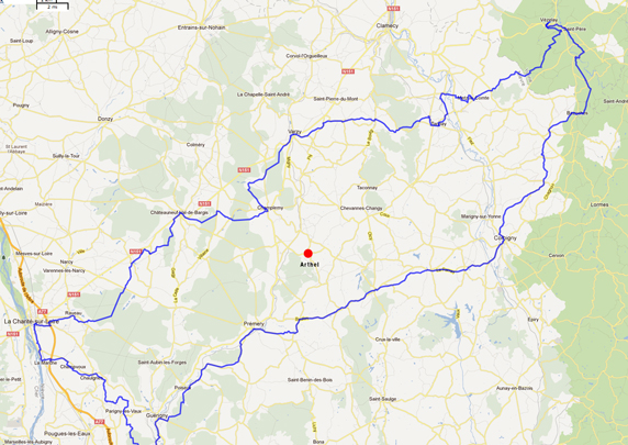 De noordlijke en zuidelijke variant van de via Lemovicensis van Vezelay naar Charite sur Loire en Nevers.